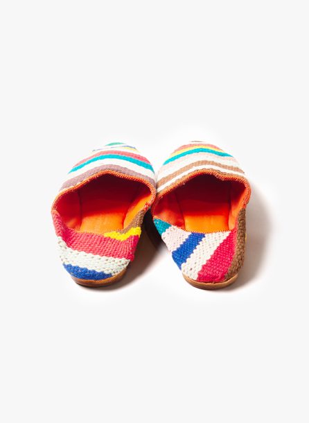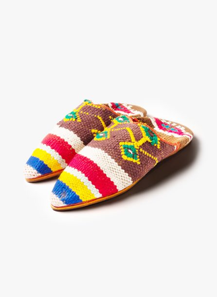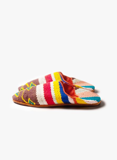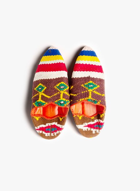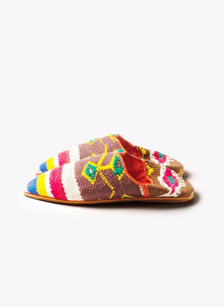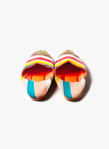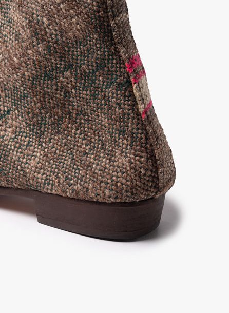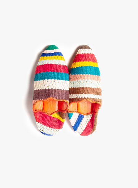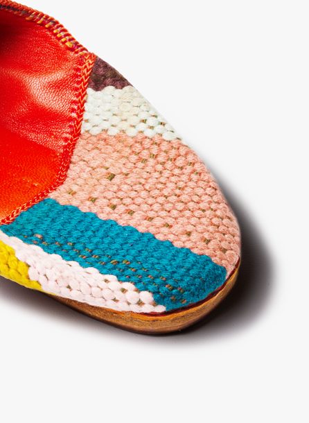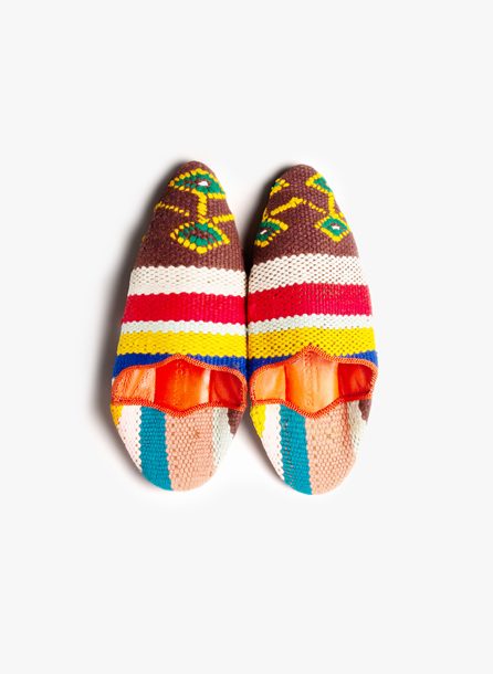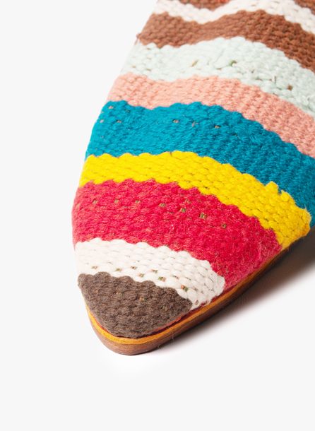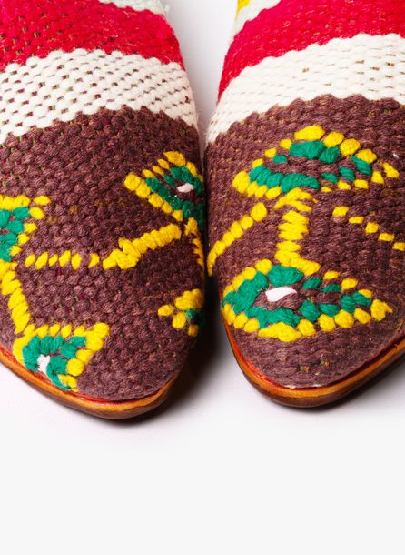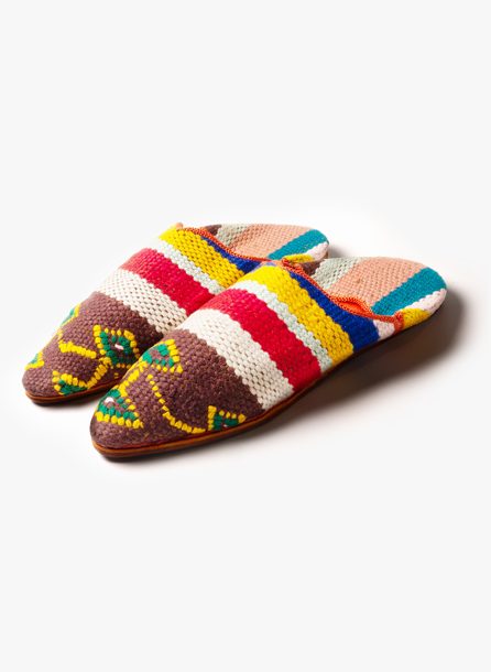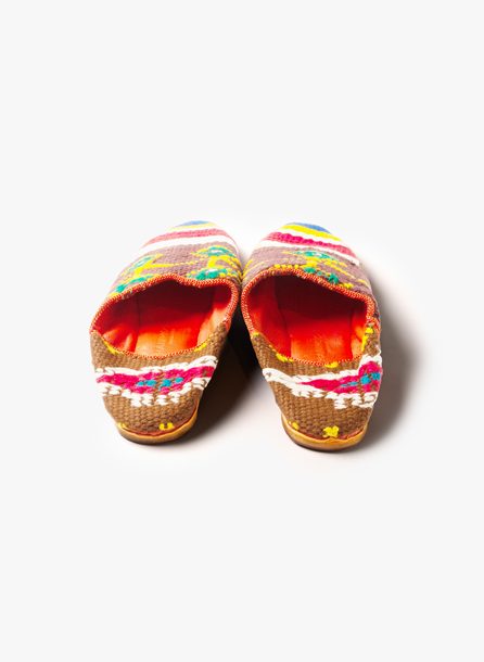 Creamos y diseñamos nuestras babuchas hechas a mano utilizando materiales que provienen de Marruecos. Ya sean los Kilims o las mantas vintage, conocidas como Haik.